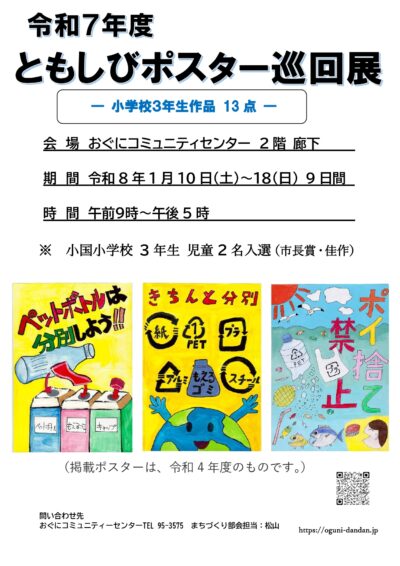 令和7年度ともしびポスター巡回展 お知らせ 2025.12.12 令和8年1月10日(土)~18日(日)ともしびポスター巡回展を開催します。小国小学校の児童が2名入選しました。この機会に是非ご覧ください。